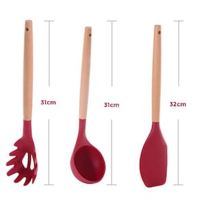 Kit Utensílios de Silicone Cozinha com Cabo de Madeira 8 Peças Vermelho Os utensílios que faltavam para sua cozinha ficar ainda mais completa ou para mandar bem naquele presente de chá de casa nova, chá de panela ou chá de cozinha, além do design lindo e diferenciado é firme e evita arranhões em suas panelas, os cabos de madeira maciça além de serem eficientes contra a trasmissão de calor também dão um toque rústico as peças e podem ser lavados com água e sabão neutro normalmente. CONTEÚDO DO KIT: 1 - Escumadeira 32cm1 - Espatula 32cm1 - Colher 31,5cm1 - Espatula Vazada 32cm 1 - Pegador de Massas 31cm1 - Concha 31cm1 - Pincel 27cm1 - Luva termica com descanço PRINCIPAIS DESTAQUES: - Evita riscos nas suas panelas- Suporta temperaturas de até 230º e negativas de até -40º- Não se deformam- Possui furo para pendurar- Cabo em madeira não transmite calor