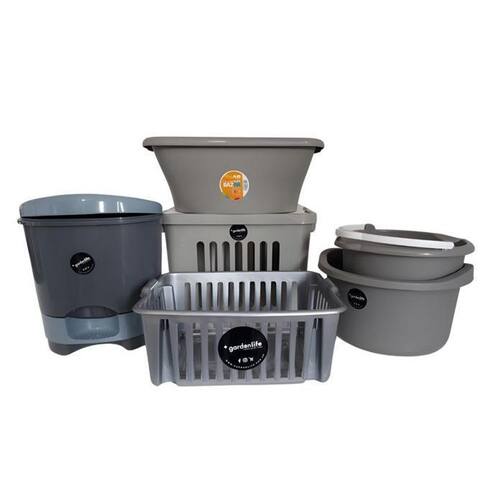 Lixeira de 12L com tampa: ideal para manter a higiene e o ambiente livre de odores. Duas bacias de 10L e 20L: perfeitas para diversas tarefas, como lavar roupas, louças ou organizar objetos. Duas cestas: ótimas para armazenar roupas, brinquedos, livros ou qualquer outro item que você precise. Balde de 9L: ideal para limpeza, jardinagem ou outras atividades. Qualidade e durabilidade: