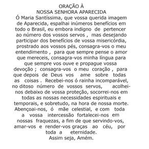Ó Maria Santíssima, que vossa querida imagem de Aparecida, espalhai inúmeros benefícios em todo o Brasil, eu embora indigno de pertencer ao número dos vossos servos, mas desejando participar dos benefícios de vossa misericórdia, prostrado aos vossos pés, consagra-vos o meu entendimento, para que sempre pense o amor que mereceis, consagra-vos minha língua para que sempre vos ouve e propague vossa devoção; Consagra-vos o meu coração, para que depois de Deus vos ame sobre todas as coisas. Recebei-nos ó rainha incomparável, no ditoso número de vossos servos, acolhei-nos debaixo de vossa proteção, socorrei-nos em temporais, e sobretudo, na hora de nossa morte. Abençoai-nos, ó mãe celestial, e com toda a vossa intercessão fortalecei-nos em nossas fraquezas, a fim de que servindo-vos, amar-vos e render-vos graças ao céu, por toda a eternidade.