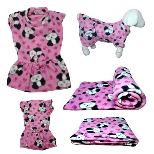 Kit vestido e manta de inverno para cachorro. - os dois em tecido soft; - ótimo para aquecer seu pet em dias de frio; - cor: rosa com estampa de panda; - vestido no tamanho: g - manta no tamanho: m Medidas vestido - g: Pescoço - 30 cm de circunferência; abdômen/tórax - 42 cm de circunferência; comprimento - 40 cm. Medidas manta - m: 70 cm de largura x 90 cm de comprimento. Marca: Nicapet