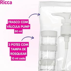 O Kit para Viagem da Ricca é prático, econômico, perfeito para organizar e transportar os produtos durante viagens. A Ricca traduz toda a diversidade e a liberdade que você busca no seu dia-a-dia, em acessórios de beleza e higiene. O Kit Contém: 3 potes, 3 frascos e 1 estojo plástico.