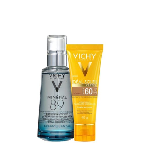 Kit com hidratante e protetor solar facial com cor. Kit Vichy Minéral 89 + Idéal Soleil Clarify FPS 60 Morena proporciona hidratação intensa, fortalece a pele e previne manchas solares, além de uniformizar o tom com alta cobertura.
