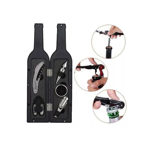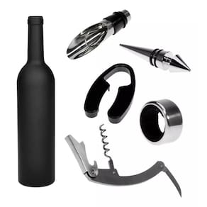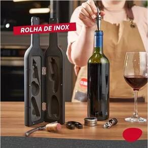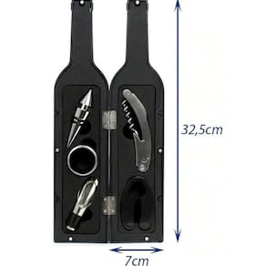 Inclui: - 1 estojo emborrachado em formato de garrafa - 1 abridor multifuncional saca rolha em inox - 1 tampa em inox - 1 dosador em inox - 1 anel salva gotas em inox - 1 cortador de lacre