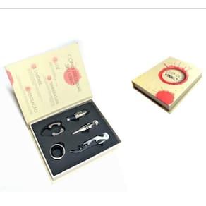 Kit para vinho formato de livro - 5 peças 1 saca - rolhas 1 anel salva - gotas 1 bico dosador 1 tampa de vinho 1 corta lacre Material: metal inoxidável Os verdadeiros apreciadores de um bom vinho precisam dos acessórios para degustá-lo de modo pleno. Kit de vinhos em um formato de livro belo e discreto.