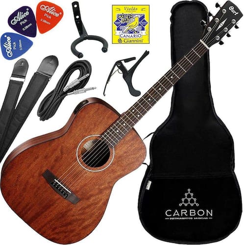 Kit violão cort af510medx op folk afinador mahogany vx02 O af 510e possui corpo com tamanho reduzido, sendo assim ele possui menos ênfase em timbres mais graves, destacando mais sons mais médio e agudos mais claros. Modelo eletro acústico, com cort ce 304t. Especificações : - modelo: af 510medx - op - série: standard series - construção: junção dovetail rabo de andorinha - formato do corpo: concert - tampo: mogno - fundo e laterais: mahogany - braço: mahogany - escala: rosewood - trastes: 20 - pré: cort - marcação: pontos - rosetta: acrílica - bracing: advanced x-bracing - binding: preto - acabamento: fosco - cor: mogno open pore itens inclusos : - violão cort af510medx op - capa bag violão - palhetas - cabo p10 / p10 - correia - suporte de parede - encordoamento - capotraste - certificado
