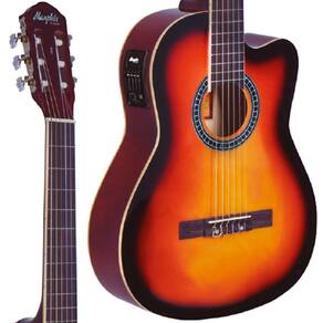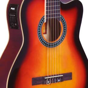 Modelo: Classical cutaway nylon Tampo: Linden Lateral e Fundo: Linden Braço: Linden Escala: Technical wood 25.5" Nut (capo traste): 50mm Número de trastes: 19 Cavalete: Black Walnut Bojo: 95mm x 100mm Captação: Piezo Pré-amplificador: MEQ-4, ativo de 4 bandas e afinador Controles: Volume, grave, médio, agudo e presence Tarraxas: 3+3 cromada com botão estilo madrepérola Cordas: Nylon (6 cordas) Cor: Drop Sunburst Com tensor Capa em nylon 600 com espuma polipack de 5mm Forração interna em non woven (TNT) Alças tipo mochila com ombreira emborrachada e alça de mão Bolso externo 30 x 40 cm Zipper: 8 mm