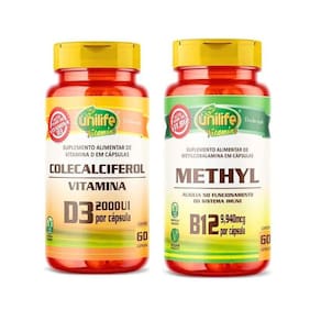 Kit com 1 un de Suplemento Alimentar Natural de Vitamina B12 Metilcobalamina Vegano 60 cápsulas 350mg e 1 un de Vitamina D3 2000 U.I. Colecalciferol 60 cápsulas de 470mg
