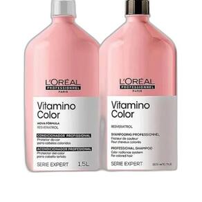 As fórmulas do Kit LOréal Professionnel Vitamino Color Resveratrol Duo contam com o poderoso antioxidante resveratrol, que combate os radicais livres responsáveis pelo desbotamento da cor. Ainda sela as cutículas para evitar a perda de pigmento, garantir toque macio e adicionar brilho.