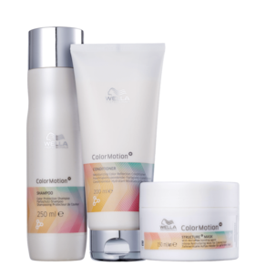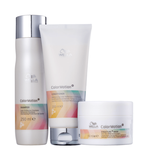Kit com shampoo, condicionador e máscara para cabelos coloridos e danificados. Kit Wella Professionals Color Motion+ Trio oferece três benefícios especiais: proteção da cor, brilho intenso e cabelos mais fortes, da raiz às pontas.