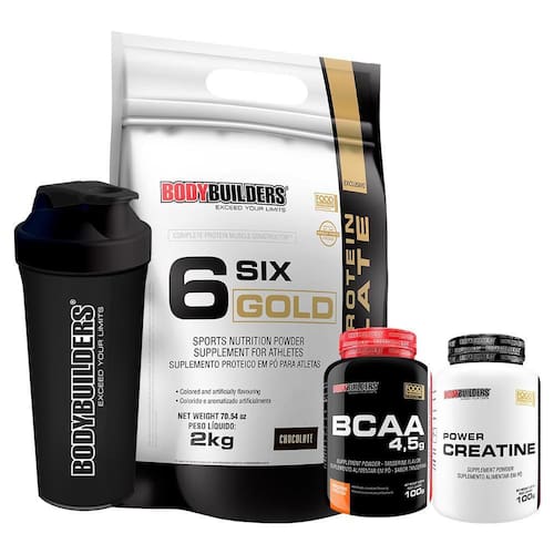Kit whey six isolate gold 2kg + creatina 100g + bcaa 100g tangerina + coqueteleira - bodybuilders Sabor: chocolate Kit 100% whey protein isolado 2kg + creatina 100g + bcaa 100g + coqueteleira - bodybuilders 1x 100% whey protein isolado - refil de 2kg1x creatina - pote 100g1x bcaa - pote 100g1x coqueteleira - 600 ml Descrição: 100% whey protein isolado six gold - refil 2 kg proteína isoladaA aliando alta qualidade com um delicioso sabor, o whey protein isolado six gold é ideal para atletas que buscam ganho de massa.B além da proteína isolada, contém outros 6 tipos de proteínas.C potencializa o aumento e a força dos feixes musculares quando associada a um programa de exercícios físicos 100% creatina: 1 unidade de 100gA é formada a partir da associação de 3 aminoácidos de alto valor biológico: arginina, glicina e metionina. B é usada pelo tecido muscular para a produção de fosfocreatina, fator importante na formação de adenosina trifosfato atp , que funciona como um repositor de energia. Bcaa 4.5: 1 pote com 100g A é um suplemento alimentar composto pelos 3 aminoácidos essenciais de cadeia ramificada, l-leucina, l-isoleucina e l-valina B auxilia na diminuição das dores musculares e fadiga, gerando assim maior energia e força para execução dos exercícios. Coqueteleira. A cor da coqueteleira é de acordo com a disponibilidade em estoque. Sugestão de consumo:A 100% whey protein isolado: adicionar 30g 3 colheres de sopa em 300ml 1 copos de água gelada e agite por 20 segundos. Consumir imediatamente após o preparo. Ingerir 2 porções diárias ou conforme orientação de médico e/ou nutricionista.B creatina: dissolver 3g 1 colher de café em 100ml /2 copo de água. Recomenda-se ingestão de 1 porção ao dia. a porção indicada fornece 3g de creatina. O consumo de creatina acima de 3g ao dia pode ser prejudicial à saúde. Não exceder a dose recomendada .C bcaa: sugere-se 1 porção de 5g 1 colher de chá diluída em 200ml 1 copo de água. Consumir imediatamente após o preparo.