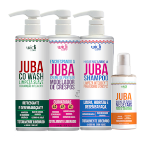 LOC (Líquido, óleo, creme): Após lavar e tratar os cabelos, divida-os em mechas e com os fios bem molhados, aplique uma pequena quantidade do Juba Blend de Óleos Vegetais nas mãos e espalhe nos fios. Continue a finalização aplicando o seu creme de pentear Juba favorito, fitando o cabelo para uma melhor definição.