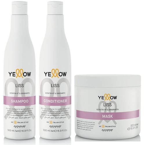 O Yellow Liss Shampoo 500ml possui fórmula que lava delicadamente, disciplinando até os cabelos mais rebeldes.Indicado: Para cabelos ondulados, lisos naturais ou quimicamente tratados.Ativos: Na fórmula temos keratin-ht, queratina de alta tecnologia, potencializada em laboratório, que inteligentemente simula a queratina natural do cabelo e é capaz de reparar as áreas mais danificadas. Para um cabelo com aparência saudável e sem imperfeições. Além de óleo de amaranto, particularmente rico em emolientes, proteínas, sais minerais e vitamina e, este óleo, além de nutrir o cabelo em profundidade, envolve-o em uma fina, mas forte barreira que dificulta a penetração da umidade no interior, protegendo-o por muito tempo. Modo de Usar: Aplique sobre os cabelos molhados, massageando suavemente. Enxágue.A nova linha Yellow Liss é dedicada a cabelos rebeldes e indisciplinados,que precisam de ajuda extra para ficarem perfeitamente lisos por muito tempo, mesmo em condições extremas. Na fórmula temos keratin-ht, queratina de alta tecnologia, potencializada em laboratório, que inteligentemente simula a queratina natural do cabelo e é capaz de reparar as áreas mais danificadas. Para um cabelo com aparência saudável e sem imperfeições. O Yellow Liss Condicionador 500ml é um precioso aliado para domar os cabelos ondulados e sem controle. A sua textura delicada suaviza e alisa a superfície do cabelo sem pesar. Adeus ao efeito frizz, redução drástica de volume e cabelos perfeitamente maleáveis. Indicado para um uso diário.Indicado: Para cabelos ondulados, lisos naturais ou quimicamente tratados.Ativos: Além de óleo de amaranto, particularmente rico em emolientes, proteínas, sais minerais e vitamina e, este óleo, além de nutrir o cabelo em profundidade, envolve-o em uma fina, mas forte barreira que dificulta a penetração da umidade no interior, protegendo-o por muito tempo. Modo de Usar: Após o uso do shampoo, apliqueo o Condicionador Yellow Liss massageando suavemente. Deixe agir por alguns minutos e enxágue.A Máscara Condicionadora Yellow Liss 500ml é um concentrado de ingredientes e ativos com propriedades alisadoras. A sua textura envolve e nutre profundamente a fibra dos fios.A nova linha Yellow Liss é dedicada a cabelos rebeldes e indisciplinados, que precisam de ajuda extra para ficarem perfeitamente lisos por muito tempo, mesmo em condições extremas. Ideal para cabelos ondulados, lisos naturais ou quimicamente tratados.Ativos: Na receita temos keratin-ht, queratina de alta tecnologia, potencializada em laboratório, que inteligentemente simula a queratina natural do cabelo e é capaz de reparar as áreas mais danificadas. Para um cabelo com aparência saudável e sem imperfeições. Além de óleo de amaranto, particularmente rico em emolientes, proteínas, sais minerais e vitamina e, este óleo, além de nutrir o cabelo em profundidade, envolve-o em uma fina, mas forte barreira que dificulta a penetração da umidade no interior, protegendo-o por muito tempo. Indicado: Para cabelos ondulados, lisos naturais ou quimicamente tratados.Modo de Usar: Com os cabelos úmidos, aplique a máscara Yellow Liss do comprimento até as pontas. Deixe agir por 2 a 3 minutos e enxágue.