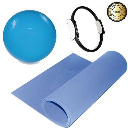 Kit yoga pilates funcional anel tapete e bola suíça Cor: azul O anel de pilates, auxilia na prática do pilates, yoga, treinamento funcional, reabilitação, proporcionando fortalecimento dos músculos do core, coxas glúteo, abdômen, peito e braços. O anel possui pegadores aderentes e confortáveis, que facilita a execução dos exercícios. O anel de pilates é fabricado com material de alta resistência e durabilidade, com padrão internacional de qualidade. Dados técnicos: - material: revestido com abs e eva - medida: 38cm de diâmetro - peso: 620 grama - : 3 meses - cor: preto / cinza A bola suiça para ginástica - 55 cm, pode ser utilizada em academias, treinamento funcional, pilates, fisioterapia, reabilitação, oferecendo uma variedade de exercícios com diferentes graus de intensidade., tonifica a musculatura, exercita o equilíbrio, coordenação motora, flexibilidade, alongamento. A bola é produzida com material de ótima qualidade e com padrão internacional, possui material antiderrapante com sistema anti estouro. Dados técnicos: - tamanho: 55 cm - capacidade: suporta até 200 kg - com sistema anti estouro - cor: azul - peso com embalagem: 800 gramas - não acompanha bomba - vendida murcha com pino para fechamento do bico - foto ilustrativa O tapete de yoga mat esteira de yoga em eva - azul - 1,20m x 0,60m x 5mm, serve de apoio para exercícios físicos de baixo impacto e alongamentos como exercícios de pilates, yoga, abdominais, alongamentos com maior conforto. Desenvolvido com uma densidade adequada para diversas práticas esportivas como yoga, rpg, pilates, abdominais, flexões, exercícios para glúteos, o tapete em eva é ideal também para uso em academias, clínicas, apartamentos, casas e até em locais externos, como parques. Tem como características ser leve, flexível, atóxico e lavável. Dados técnicos: - material: eva - tamanho: 1,80m x 0,60m x 5mm - cor: azul - peso: 625g O kit compõe de 1 anel de pilates + 1 bola suíça 55cm + tapede de eva azul.