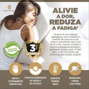 Projetado para o seu conforto Feito de espuma visco elástica, este travesseiro lhe dará firmeza e solidez quando você dorme. Seu material é caracterizado por ser resistente: oferece um formato auto adaptável e anatômico, ideal para um relaxamento completo e satisfatório.