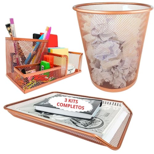 Kit3 Escritório Bandeja Organizadora Lixeira Aramad Rosegold