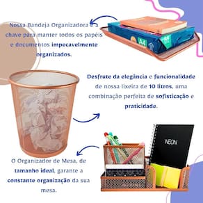 Kit completo de escritório com 9 produtos rose gold - cesto lixo, porta caneta organizador de mesa e bandeja organizadora para documentos