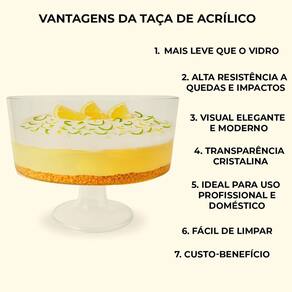Descrição: Sirva suas sobremesas favoritas com muito mais charme Perfeita para mousses, saladas de frutas, pavês e outras delícias. Com design elegante e formato arredondado, ela valoriza a apresentação dos pratos e traz um toque sofisticado à sua mesa. Ideal para momentos especiais ou para tornar o dia a dia mais bonito. Vantagens: Capacidade Ideal: 2,200L , perfeita para porções generosas de sobremesas. Versatilidade: Ideal para mousses, pavês, saladas de frutas e muito mais. Durabilidade: Fabricada com material resistente para uso frequente. Praticidade: Fácil de limpar e armazenar. Beleza na Mesa: Deixa qualquer ocasião mais elegante e convidativa.