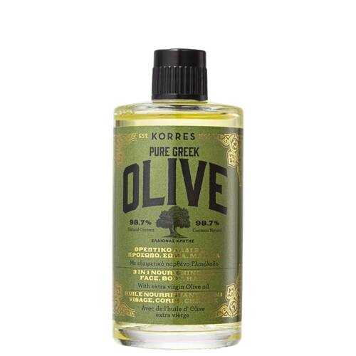 Óleo multifuncional para o rosto, corpo e cabelo. Com fórmula leve e de rápida absorção, Korres Pure Greek Olive 3 em 1 promove nutrição intensiva e ação Redutor de Linhas.