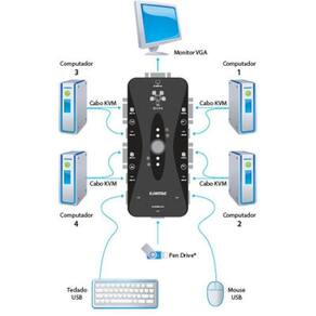 Acompanha: - Switch KVM USB com 4 portas USB Comtac
