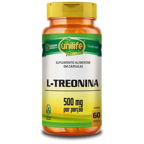L-treonina unilife 500mg 60 cápsulas Modo de uso: Sugere-se a ingestão de 2 cápsulas ao dia após a refeição. Ingerir com líquido. Ingredientes: L-treonina, agente de massa celulose e antiumectantes dióxido de silício e estearato de magnésio. Cápsula: gelatina vegetal e água purificada. Peso total de cada cápsula: 500mg. Não contém glúten. Livre de lactose. Produto vegano. Produto autorizado para comercialização em todo o território nacional através do anexo i da rdc 240/2018 da anvisa. Afe do ms 6.02234-1. Marca: Não Informado