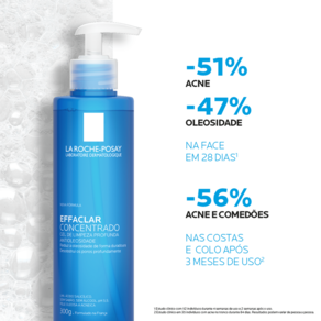 Gel de limpeza para peles mistas e oleosas. Effaclar Concentrado desobstrui os poros profundamente e ajuda na redução da acne.
