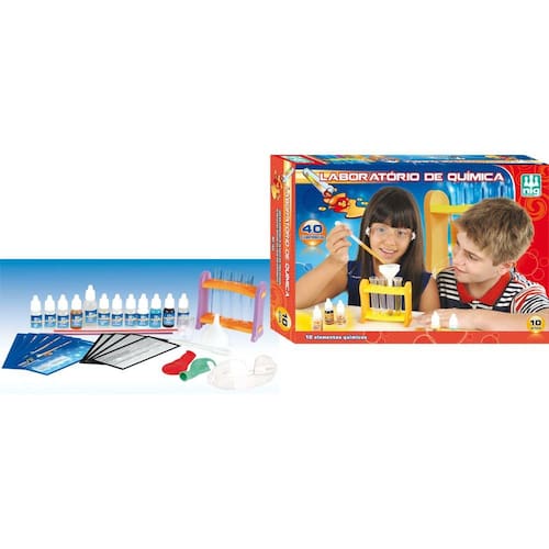 Super laboratório com experimentos químicos testados por professores e fenômenos que vão surpreender a todos. São 10 reagentes químicos para a criança conhecer e praticar 40 experiências, seguindo as fichas de instrução. O laboratório acompanha ainda quatro tubos de ensaio, uma pipeta, canudos, bexigas e estante de EVA para organizar o material. Ref. 1633 + 10 anos Plástico + reagentes + cartão 40 experiências 1 ou mais pessoas 43,0 x 30,0 x 6,0 cm