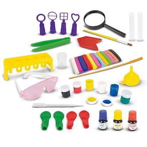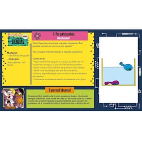 Conteúdo da Embalagem: 1 óculos de segurança, 1 lupa, 6 tintas guache, 1 pincel, 1 barquinho de EVA, 4 bexigas, 1 funil, 3 corantes alimentícios, massa de modelar, 1 régua de papel, 1 vareta plástica, kit bolhas de sabão, 1 pinça de plástico, 1 pipeta, 1 estante para tubo de ensaio, quadro impressão de digital, cartões impressos fases da lua , 1 copinho, 2 tubos de ensaio, cartões Bidu, cartões em branco, tabelas de artrópodes, arco-íris em cartão