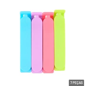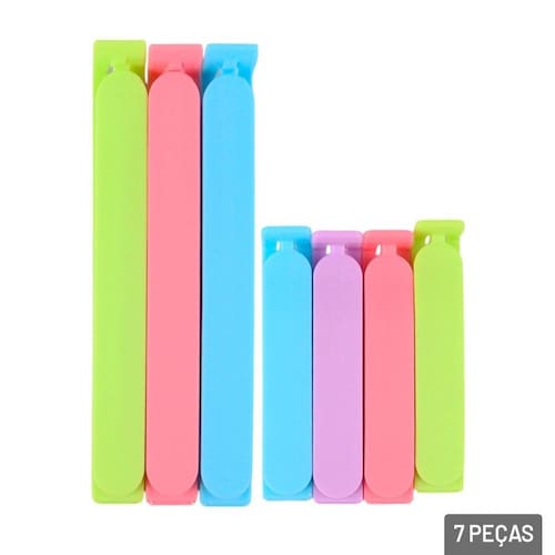 Lacre Para Embalagem 7 Peças Tamanhos Sortid Mantenha seus alimentos e produtos sempre bem fechados, frescos e organizados com o Kit de Lacres para Embalagem. Perfeitos para o dia a dia na cozinha, despensa ou até mesmo para levar lanches e porções na bolsa, esses lacres são práticos, reutilizáveis e muito fáceis de usar.\nFabricados em plástico resistente e flexível, os lacres oferecem excelente vedação, preservando o conteúdo de pacotes de alimentos, como biscoitos, grãos, massas, rações, entre outros. O conjunto contém 7 unidades em tamanhos variados, o que permite seu uso em diferentes tipos e espessuras de embalagens.\nEspecificações:\nMarca : ETILUX\nTipo de material : Plástico\nCores ou Estampa : Colorido\nDimensões do Produto : 21 X 10 X 1,5 CM\nDimensões da Embalagem : 21 X 10 X 1,5 CM\nPeso Bruto (Gramas) : 0.047