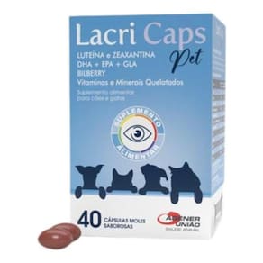 Lacri caps pet c/40 caps Suplemento alimentar lacri caps pet é composto por vitaminas, aminoácidos, polifenóis e ácidos graxos essenciais derivados de peixes marinhos e óleo de borragem. É indicado para cães e gatos que necessitem da suplementação desses nutrientes, auxília na lubrificação e saúde ocular.Contém 40 cápsulas moles saborosasModo de usarAdministrar a cápsula inteira ou o conteúdo da cápsula de acordo com a seguinte dose: 1 cápsula ao dia para cães e gatos de até 10kg.