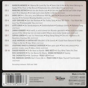 Marilyn Monroe, Marlene Dietrich, Sophia Loren, estas e outras estrelas da grande tela não fizeram história apenas no cinema. Elas deixaram suas marcas na parada de sucessos musicais também. Títulos como I wanna be loved by you ou Falling in love again são clássicos. Atrizes cantoras como Doris Day, Eartha Kitt, Lace Lenya, Zarah Leander, Judy Garland, Ginger Rogers, Josephine Baker, Rita Hayworth, Julie Andrews e muitas outras estão reunidas nesta compilação que atravessa os anos de 1929 a 1960. Todas estas faixas