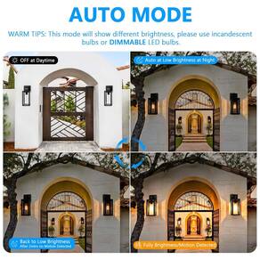 Modo de substituição manual exclusivo Se você quiser que essas arandelas de parede externas com sensor do crepúsculo ao amanhecer ofereçam forte brilho à noite por várias horas para ocasiões como festa, reunião de família ou outras ao ar livre, desligue o interruptor de parede com 0,52 seg. para mudar para o modo manual de um automático, mantendo 100 de brilho por 8h, mas desligará automaticamente ao amanhecer. Luzes semelhantes compradas de outros não têm sensor de movimento ou modo de substituição manual, bastante amargo para a demanda de alto brilho de longa data.