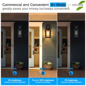Sensor de movimento super inteligente e sensor do crepúsculo ao amanhecer nossas luzes de parede externas com sensor de movimento externo são construídas com tecnologia de movimento PIR avançada e sensor de iluminação IC, ele liga automaticamente com 25 de brilho ao anoitecer e se transforma em iluminação total uma vez movimento detectado, permaneça ligado enquanto o movimento durar, depois volte à luz fraca após 2 minutos sem movimento, desligue automaticamente ao amanhecer. Além disso, exatamente uma ampla faixa de distância do sensor de movimento 12 metros, 220 graus torna mais conveniente o uso.