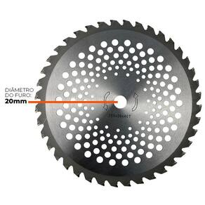 Lâmina faca circular disco 40 dentes furo 20mm para roçadeira sthil fs160 fs220 fs280 fs290 - super leve, resistente e de alta durabilidade, não força a roçadeira; - ideal para utilização em campos, chácaras, sítios e fazendas, no corte de matos densos, vegetação, pastos e plantações; - dentes com vídeas, fortes, projetados para suprir serviços pesados, como cortes de raízes, pequenos galhos, caules e arbustos. Especificações técnicas: - material: aço; - diâmetro do furo de montagem central : 20mm - diâmetro da lâmina: 255mm - espessura da lâmina: 1,5mm de 03 meses Ean: 7908227607657