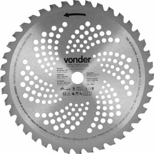 Lâmina circular com vídea, para roçadeiras, 255 mm x 20 mm, 40 dentes, VONDER