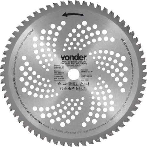 Lâmina circular com vídea, para roçadeiras, 255 mm x 20 mm, 62 dentes, VONDER