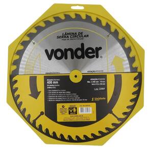 DESCRIÇÃO:Indicada para cortar madeiras. Nunca exceder a rotação máxima rpm - risco de acidente e/ou queima da lâmina. Não cortar madeiras impregnadas com massa ou cimento. Para cortes em MDF, a vida útil da serra e o nível de qualidade do acabamento serão reduzidos. A Vonder disponibiliza em seu mix, serras apropriadas para cortes em MDF. CARACTERÍSTICAS:- Corpo em aço carbono- Dentes de metal duro/vídea que proporcionam maior vida útil. DETALHES TÉCNICOS:- Diâmetro externo: 400 mm- Nº de dentes: 36- Diâmetro do furo: 30 mm- Diâmetro da bucha de redução: De 30 mm para 16 mm- Material do corpo: Aço carbono- Rotação máxima rpm : 3.300/min- Espessura de corte: 4,5 mm- Espessura do corpo: 3,0 mm- Garantia legal: 90 dias. CONTEÚDO DA EMBALAGEM:- 1 Lâmina de serra circular;- 1 bucha de redução.