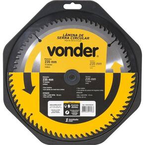 Lamina De Serra Circular 450mm 18 60D Vonder - 46 50 450 600 Indicada para cortar madeiras. Nunca exceder a rotação máxima rpm - risco de acidente e/ou queima da lâmina. Não cortar madeiras impregnadas com massa ou cimento. Para cortes em MDF, a vida útil da serra e o nível de qualidade do acabamento serão reduzidos. A Vonder disponibiliza em seu mix, serras apropriadas para cortes em MDF. Corpo em aço carbono com dentes de metal duro/vídea que proporcionam maior vida útil Diâmetro da lâmina de serra circular:18 - 450 mmNúmero de dentes da lâmina de serra circular:60 dentesEspessura de corte da lâmina de serra circular:5,0 mmEspessura do corpo da lâmina de serra circular:3,2 mmDiâmetro do furo da lâmina de serra circular:30 mmRotação máxima da serra circular rpm :2.900/minVelocidade periférica máx. :70 m/sTamanho da bucha de redução:De 30 mm para 16 mm Imagem meramente Ilustrativa