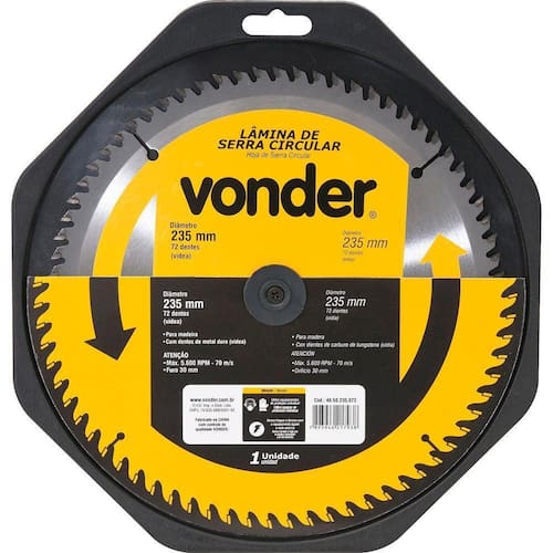Conteúdo da embalagem1 Lâmina de serra circularAplicações e dicas de usoIndicada para cortar madeiras e derivados. Nunca exceder a rotação máxima rpm - risco de acidente e/ou queima da lâmina. Não cortar madeiras impregnadas com massa ou cimento.Destaques e diferenciaisCorpo em aço carbono com dentes de metal duro/vídea que proporcionam maior vida útil DETALHES TÉCNICOS Diâmetro da lâmina de serra circular: 18 - 450 mm Número de dentes da lâmina de serra circular: 60 dentes Espessura de corte da lâmina de serra circular: 5,0 mm Espessura do corpo da lâmina de serra circular: 3,2 mm Diâmetro do furo da lâmina de serra circular: 30 mm Rotação máxima da serra circular: 2.900 rpm Velocidade periférica: 70 m/s