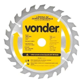 Lâmina Serra Meia Esquadria Vonder 7.1/4 Para Madeira 185mm Contém: - 01 Lâmina de Serra Circular 185mm - Vonder Detalhes Técnicos: - Material dos dentes vídea : Metal Duro- Quantidade de dentes: 24- Diâmetro do disco: 185mm- Diâmetro do furo: 16mm- Rotação Máxima rpm ; 7.200/min.- Espessura de corte: 2,6mm- Espessura de corpo: 1,5mm- Velocidade periférica máx. 70 m/s- Tamanho de bucha com redução: sem bucha de redução Características: - Indicada para cortar madeiras. Nunca exceder a rotação máxima rpm - risco de acidente e/ou queima da lâmina. Não cortar madeiras impregnadas com massa ou cimento. - Para cortes em MDF, a vida útil da serra e o nível de qualidade do acabamento serão reduzidos. A Vonder disponibiliza em seu mix, serras apropriadas para cortes em MDF. - Corpo em aço carbono com dentes de metal duro/vídea que proporcionam maior vida útil.