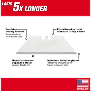 As lâminas utilitárias de uso geral da Milwaukee são projetadas para oferecer o máximo desempenho de corte e durabilidade nos materiais mais comuns encontrados em canteiros de obra. Compatíveis com estiletes padrão da Milwaukee e de outras marcas que utilizam lâminas trapezoidais, as lâminas utilitárias da Milwaukee são uma escolha versátil para profissionais que buscam alta qualidade. Com o metal disperso em metal duro, as lâminas utilitárias da Milwaukee oferecem até 3 vezes mais vida útil do que as lâminas de carbono padrão. Além disso, o processo de moagem de precisão remove as rebarbas da ponta, proporcionando cortes mais limpos. Os ângulos de moagem otimizados também oferecem maior nitidez para menos cortes repetidos.