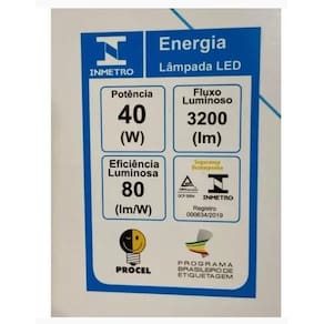 Características - tensão de entrada v = 100v / 250v - bivolt - potência max. w = 40 watts - base = e27 - equivalência = 240w incandescente / 80w fluorescente - temperatura de cor k = branco frio 6500k - luminosidade lm = 3200 lumens - índice de reprodução de cor = =80 - material = alumínio injetado + policarbonato - economia = 80% + economia - vida útil mediana horas = 25.000 horas - fator potência: =0.92 - dimensões: 81 x 129mm - irc: 80 r90 - frequência: 50/60hz - peso: 62g - ef luminosa: 80 lm/w