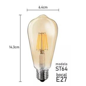 LÂMPADA BULBO LED FILAMENTO ST 64 Cor: Branco Tamanho: P LÂMPADA BULBO LED FILAMENTO E27 ST 64 KIAN Requinte e sofisticação são alcançados quando se aplica a linha de lâmpadas retrô Filamento de Carbono. Dimerizáveis, com bulbos de diferentes formatos, esta linha traz o que existe de mais atual na aplicação de lâmpadas com fins decorativos. Design retrô para aplicação decorativas, versatilidade de formatos, excelente reprodução de cores, Ideal para decorar ambientes. Especificações técnicas: * Modelo Lâmpada Filamento de Carbono ST64 40W 2400K - Kian 220v * Potência 4W * Cor Amarela - 2400k * Temperatura de Cor 2.400k Âmbar * Branco Quente * Fluxo Luminoso Decorativo * Base E27 * Vida Mediana 2.000 horas * 3 Meses * Dimensões 143X64mm Atenção, Imagens meramente ilustrativas: - Não nos responsabilizamos por montagens e instalações mau realizadas. Certifique-se que de que algum eletricista faça a montagem e instalação do produto de forma correta. - O produto pode sofrer pequenas alterações de cores. Os demais itens e objetos de decoração nas imagens, não acompanham o produto. - Favor conferir mercadoria no ato do recebimento. Marca: Não Informado Ean: 7899710010477