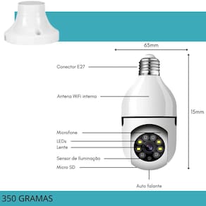 Descrição do anúncio: A câmera lâmpada wi-fi ip de segurança é a solução ideal para monitorar a sua casa ou empresa. Com instalação fácil e rápida, basta conectá-la em um bocal de lâmpada comum. Oferece visão em tempo real, controle de movimentação e zoom pelo celular, além de luz e áudio bidirecional. Possui alta resolução full hd 1080p e detector de movimento que envia notificações diretamente para o seu celular.