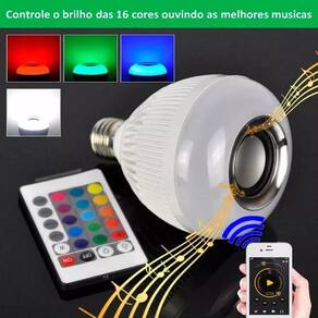 Lâmpada Controle Musical De Led Caixa De Som Bluetooth Lâmpada bulbo 12w de potência que toca música e ainda tem controle remoto com 24 funções. Ela pode reproduzir músicas do seu celular, ou de qualquer outro dispositivo, que tenha bluetooth, com alta qualidade de som. Possui luz com ótima intensidade, além de 4 modos para operar as luzes. Características: - Cor: Rgb - Lâmpada bluetooth com controle remoto - Bocal: E27 é o bocal comum que temos em casa. - Lâmpada possui a capacidade de receber áudio via bluetooth. Assim você consegue reproduzir suas músicas e controlar as luzes por um controle remoto que já vai incluso. - Voltagem: AC 100-240V / 50-60 Hz - Potência: 12w - Potência do led: 7w - Potência do som: 3w - Frequência de resposta: 135Hz para 15KHz - Wireless: 3.0 - Distância de funcionamento: 10m Conteúdo da embalagem: - 01 Lâmpada bulbo rgb com bluetooth - 01 Controle remoto com 24 funções Dimensões aproximadas da lâmpada: - Circunferência aproximada: 30cm Homologação Anatel: 118782214976 Ean: 7894542358049