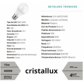 Lampada Cristallux Led Bulbo - 15w 6500k A melhor forma de iluminar qualquer ambiente com máxima economia. As lâmpadas de 16W são ideais para iluminação de áreas internas e externas. Com certificação do INMETRO. Por sua alta potência são indicadas principalmente para áreas com pé direito altos como galpões e quadras poliesportivas fechadas. A lâmpada LED economiza até 90% de energia elétrica quando comparada às lâmpadas incandescentes.