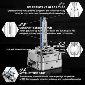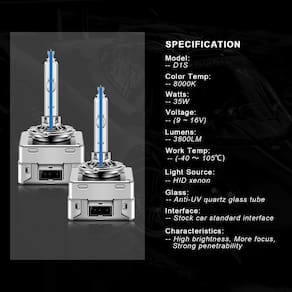 Especificação: Tipo de lâmpada: D1S Tensão de entrada: 12V Potência de saída: 35W Temperatura de cor: 8000K Lúmen: até 7600lm/set Vida útil: mais de 3.500 horas Classe à prova d'água: IP68 Temperatura de trabalho: -40°C a +105°C Pacote incluindo: 2 unidades de lâmpada de farol D1S HID 8000k, 1 luva Aplicação: Substituição de farol de alto baixo farol de carro Nota: Estes D1S lâmpadas adequadas apenas para lâmpadas de xenônio padrão. Substitua o número de peça 66140, 66140CBI, 66142, 66043, 66144, 66144CBI, 85415C1, 85415WX, 85415XV, 85410C1, 85410WX, ect. Características: 1, longa duração: longa vida útil, alto brilho, ampla faixa de iluminação e baixo consumo de energia. 2, Material de arame: resistente, resistente a altas temperaturas e resistente ao desgaste. 3, Material de vidro: vidro de quartzo forte, evita que o espelho do carro de fábrica e o abajur se quebrem e atomizem. 4, IP68 à prova d'água: reduz a chance de curto-circuito. 5, Suporte de lâmpada: o suporte de lâmpada de materiais de alta temperatura pode evitar a vaporização e atomização causadas pela iluminação. 6, Distância focal precisa: a mesma luz da lâmpada padrão pode evitar reflexos. 7, o design Plug and Play, facilita a instalação. Dicas: Use luvas para instalar a lâmpada D1S HID para evitar impressões digitais no tubo. Nota: Verifique com o tipo de lâmpada padrão, consulte o manual do usuário. - BRILHO: A lâmpada de farol HID de xenônio WinPower D1S produz 3800 lúmens de luz, brilhante para iluminar a mancha escura no horizonte, bem no centro da estrada, a luz era uniforme e simétrica, com uma visão mais clara. - LONGA VIDA: A lâmpada D1S HID usa emissão eletrônica de gás de excitação, consome 35W de eletricidade, reduz bastante a carga no sistema elétrico do veículo. Essas lâmpadas de xenônio D1S usam base de stents de metal que é de alta temperatura e mais duradoura do que o material PPS padrão. Dura mais de 3500 horas de vida útil. - ALINHAMENTO EXATO: Cada lâmpada de farol D1S HID é alinhada a laser à base durante o processo de fabricação para garantir um padrão de feixe estreito. Com uma mistura de gás xenônio que é medida até a temperatura de cor adequada e não desbota com o tempo. - CONFIABILIDADE: a lâmpada do farol de xenônio D1S HID funciona a 85 volts; quando o sistema de alimentação do veículo e a bateria falham, o reator é desligado automaticamente para parar de funcionar. Um foco de distância aprimorado com um brilho reduzido para uma visão clara da estrada lateral e da estrada descendente. - FÁCIL INSTALAÇÃO: Plug N Play. Projetado para caber no compartimento da lâmpada de fábrica da D1S sem a necessidade de fiação ou modificação.