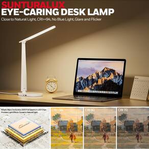 - [Simula a luz solar natural]: lâmpadas de mesa para escritório com 48 lâmpadas LED de espectro completo Sunturalux, a lâmpada de mesa oferece iluminação brilhante e natural semelhante à luz solar. Esta luz suave é livre de luz azul prejudicial, brilho e cintilação, oferecendo uma experiência mais agradável aos olhos. Com um alto CRI =94, a luz exibe as cores com precisão, fazendo com que pareçam vibrantes e fiéis à vida. Além disso, luzes de mesa para escritório em casa com uma vida útil de 30.000 horas, são perfeitas para longas horas de leitura, estudo ou trabalho