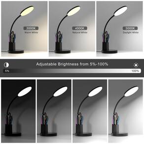 Com o suporte de caneta e suporte de telefone na lâmpada de mesa de LED multifuncional, você pode organizar a mesa reduzindo o uso do espaço na mesa. Pode armazenar seus óculos, canetas, lápis, ferramentas e muito mais, o que mantém sua mesa limpa e arrumada. A cor e o brilho da lâmpada de mesa podem ser ajustados pelo controle de toque. Pressione o botão para ajustar os 3 modos de cor e pressione rapidamente para ajustar o nível de brilho adequado para uso.