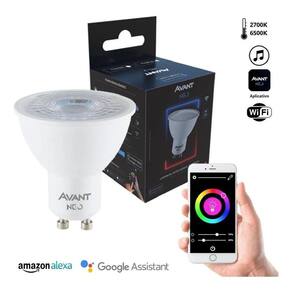 Linha Avant NeoControle a Luz Pelo CelularLâmpada Dicroica Gu10 Dimerizável OBS: Esse Modelo Não Possui RGB A Linha Inteligente Wi-Fi Avant NEO se traduz no que há de mais moderno em iluminação, sendo ideais para quem precisa de uma iluminação versátil e moderna Indicadas para ambientes internos como quartos, salas, cozinhas, escritórios e outros, você pode controlar a temperatura de cor que permite ser personalizada entre 2.700K a 6.500K.A Linha NEO proporciona a iluminação ideal para o seu humor, seja para se concentrar ou relaxar.Controle tudo pelo app Avant ou por comandos de voz com a Amazon Alexa ou Google Assistente, criando cenas e automações para deixar a sua casa ainda mais moderna e inteligente. Ideal para compor a decoração de ambientes, Promovendo também a economia de energia. Linha inteligente Avant NEO, você no controleCaracterísticas:Potência: 5WTemperatura de Cor: 2700k6500kTensão: BivoltBase: GU10Garantia:1 AnoÍndice de Proteção: IP20Dimerização: Permite Dimerização