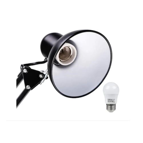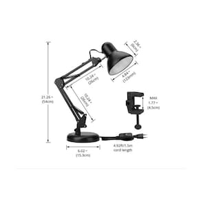 Material: metal e plástico\ nCor: preto\ nE27 Mob: (incluído)\ nVoltagem: 110-220V\ nComprimento do cabo de alimentação: 1,23 m\ nAltura do produto: 54-60 CM\ NCaracterísticas: -Acabamento em preto fosco. -Design moderno e sofisticado de braço giratório preto. -Mola de aço e botões de controle de tensão. -Os grampos são facilmente montados em qualquer mesa de design de estúdio, prateleiras e superfícies verticais ou horizontais. -Ideal para qualquer estúdio, casa ou escritório.